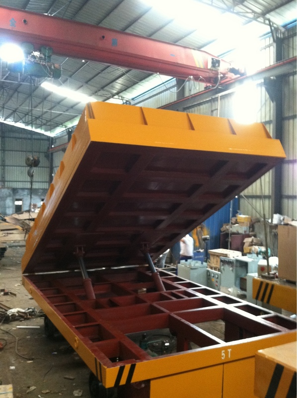 平车上方设有翻斗装置,翻斗装置采用液压系统举升,液压系统供电采用车载